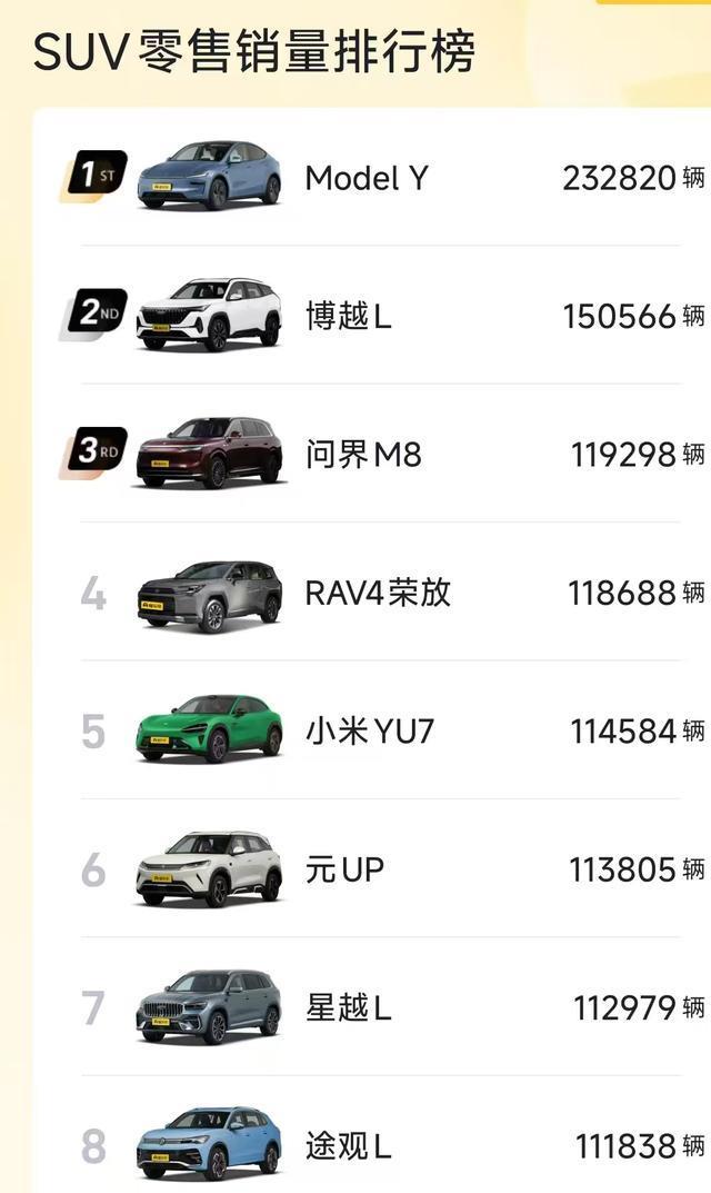 2025年还没过完,但是SUV的销量冠军已经注定了,结果和去年一样,还是特斯拉Model Y。目前它的半年销量是232820辆,遥遥领先于第二名,并且这个成绩还是不分燃油、新能源的无定语销量榜,可以说是硬的不能再硬了。而最新的乘联会数据显示金策略,Model Y 11月销量高达5.8万台,用一骑绝尘来形容都可以说是毫不为过。